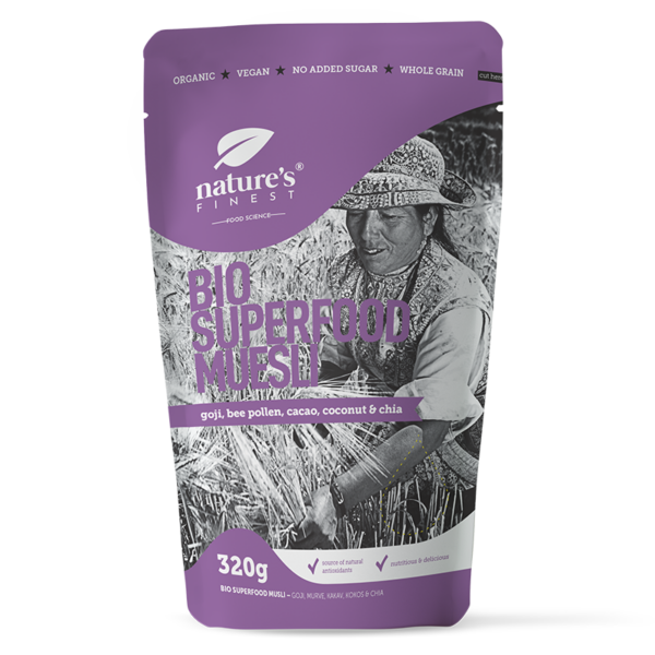 Ingredienti: Fiocchi d’avena * (40%), fiocchi di frumento (tritica) * (frumento (tritica), estratto di malto d’orzo (hordeum vulgare)) (18%), scaglie di cocco (cocos nucifera) * (8%), grano saraceno (fagopyrum esculentum) * (7%), semi di girasole (helianthus annuus) * (7%), gelsi bianchi (morus alba) * (7%), uva sultanina (thompson senza semi) * (5%), bacche di goji lycium barbarum) * (3%), fave di cacao (theobroma cacao) * (2%), semi di chia (salvia hispanica) * (2%), polline (apis mellifica) * (1%). * Ecologico