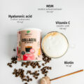 Ingredienti: Collagene in polvere, caffè solubile, amido di tapioca, MSM (metil sulfonilmetano), vitamina C (acido ascorbico), stabilizzante: cellulosa, acido ialuronico, D-biotina.