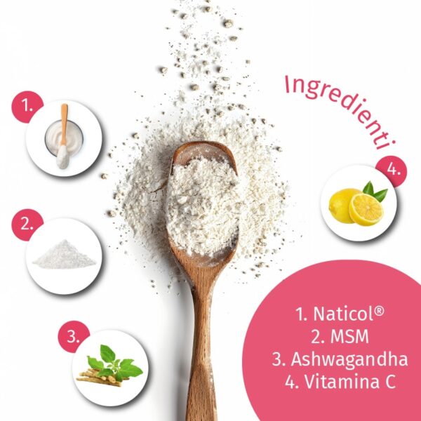 La dose giornaliera raccomandata è di 10 g (2 misurini). Mescolare in acqua e attendere 2 minuti affinché il collagene si sciolga completamente. Con 10 g di polvere assumi 5 g di peptidi di collagene Naticol.