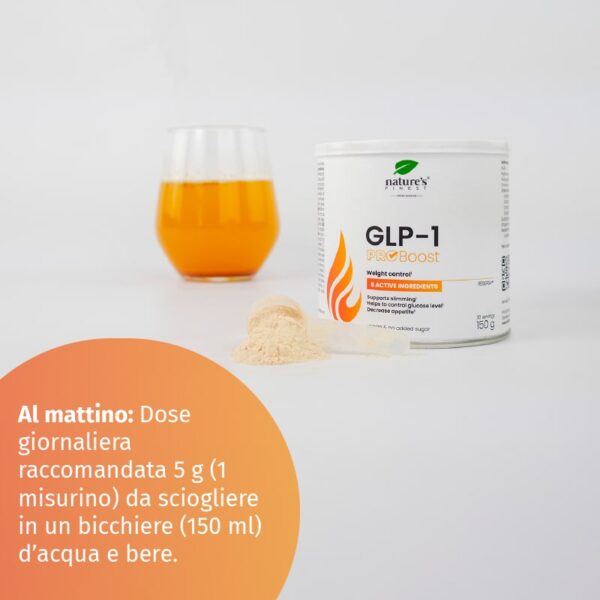 GLP-1 ProBoost: Dose giornaliera consigliata 5 g (1 misurino), da mescolare in un bicchiere (150 ml) di acqua e bere. Per una misurazione precisa, si consiglia di pesare.