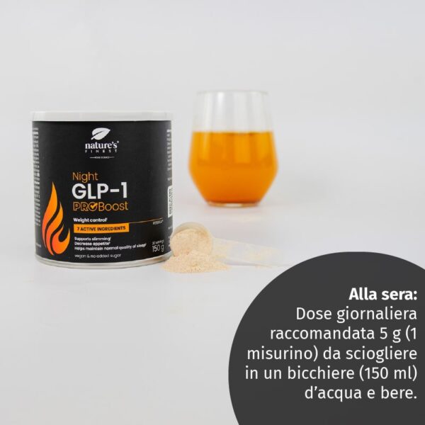 Night GLP-1 ProBoost: Dose giornaliera consigliata 5 g (1 misurino), da mescolare in un bicchiere (150 ml) di acqua e bere. Per una misurazione precisa, si consiglia di pesare.