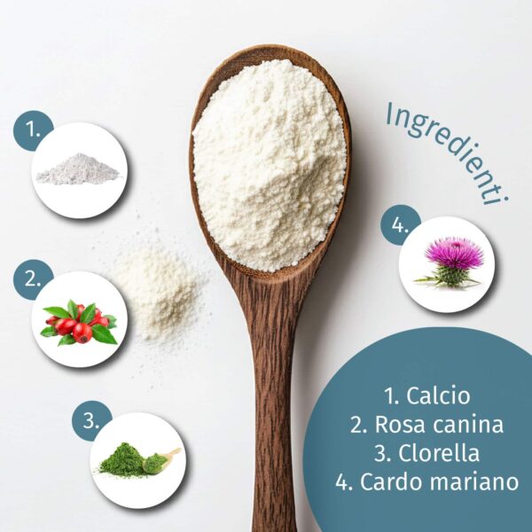 Ingredienti: inulina in polvere, buccia di psillio (Plantago ovata) in polvere, lattato di calcio, rosa canina (Rosa canina) in polvere, clorella (Chlorella vulgaris) in polvere, DigeZyme (alfa-amilasi, proteasi, lipasi, cellulasi, lattasi), estratto di cardo mariano (Silybum marianum L., semi), estratto di camomilla (Matricaria chamomilla L., fiori), estratto di curcuma (Curcuma longa, radice), estratto di carciofo (Cynara scolymus L., foglie). Contiene solfiti e zuccheri naturali.