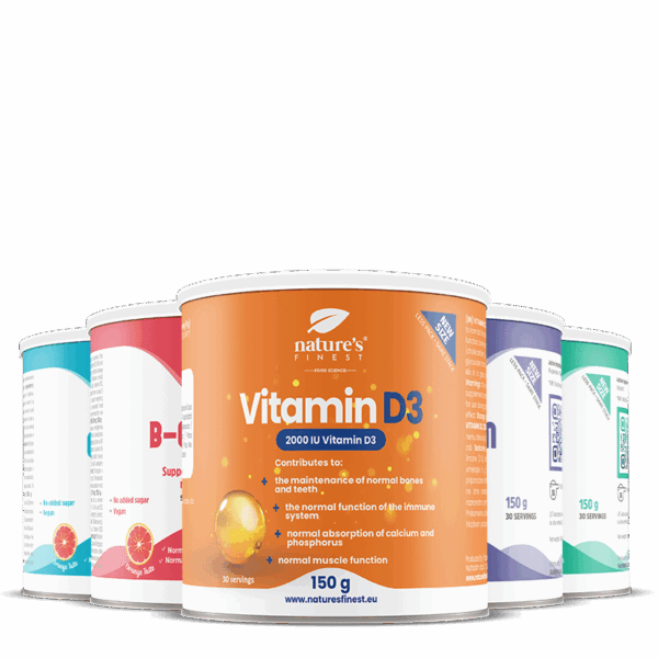 Aggiungi 5 g di ciascun prodotto (Vitamina C, Magnesio, Calcio, Complesso B e Vitamina D3) in un bicchiere d’acqua, mescola bene e bevi.